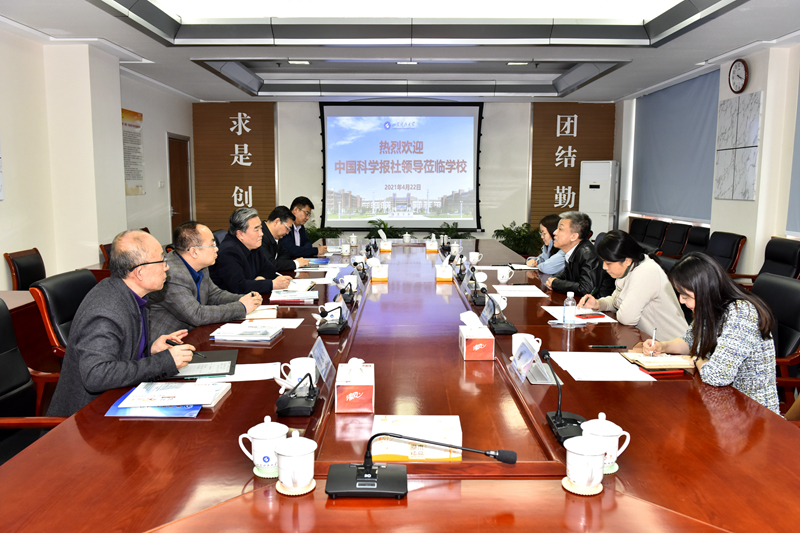 4月22日,中国科学报社党委书记刘峰松一行来校交流访问。校长姚庆国会见客人,党委副书记尹华,党委常委、宣传部部长李克周陪同会见。