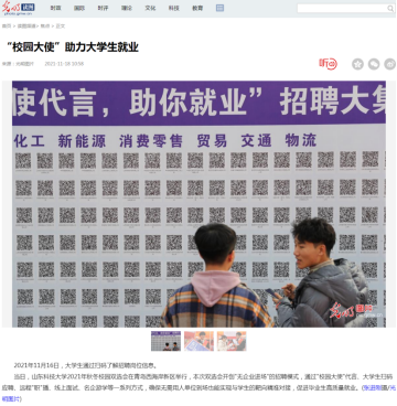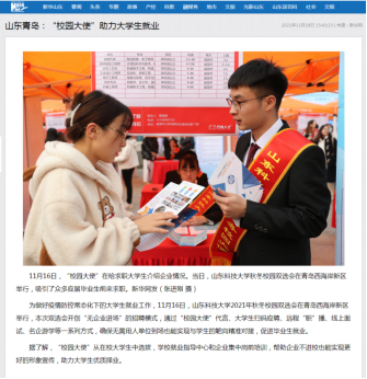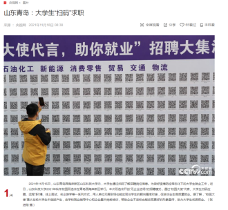 本次招聘活动受到了众多央媒的关注,新华社、《中国日报》3版、《人民日报》新媒体、央视网、央广网、光明网、中国网、中国青年网、科技日报、工人日报、中新社、《中国产经新闻》1版、《中国城市报》17版、《中国教育报》2版、新华网山东频道首页、中国山东网等主流媒体纷纷给予关注,对学校开展的创新型招聘活动进行了重点报道和推介。其中,视觉山东丨大众视觉影像库一周图片精选,中国产经新闻、新华网、光明网、大众网等媒体均在网站首页给予报道,新华社发布的新闻通稿在一些地市级媒体刊发,为推进学校创新毕业生就业平台提供了精神动力和舆论支持。(记者:徐展 通讯员:李雷 责编:韩洪烁)