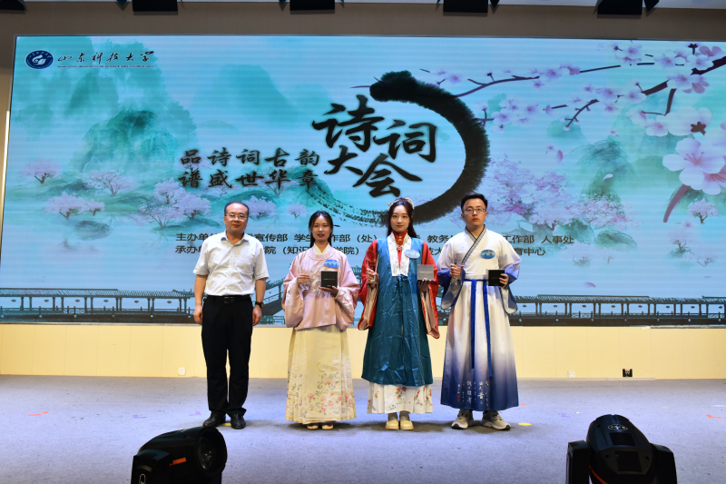 5月28日,伟德bv国际体育人文素质教育中心成立仪式暨“品诗词古韵 谱盛世华章”诗词大会举办。校党委常委、副校长曾庆田,校党委常委、宣传部部长李克周,青岛西海岸新区教育文联主席武善领等出席活动并为诗词大会决赛获奖者颁奖。