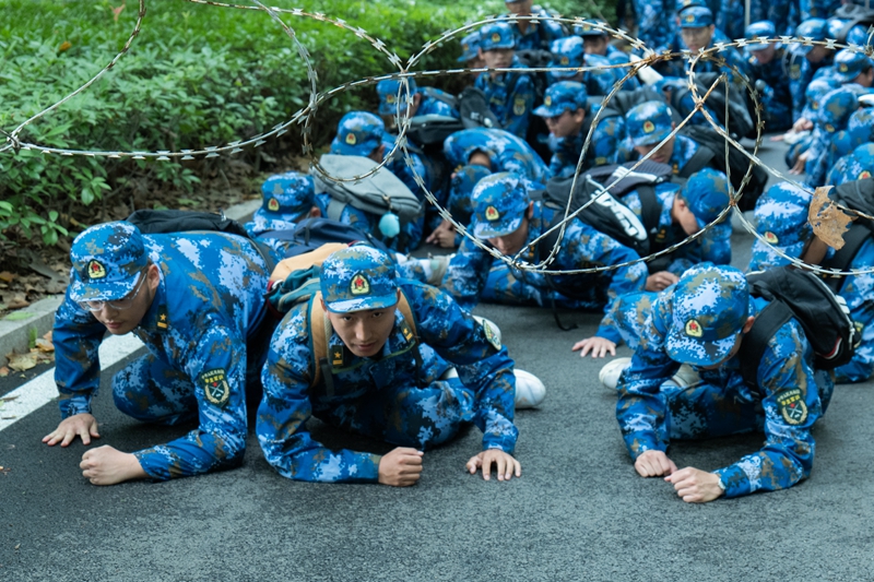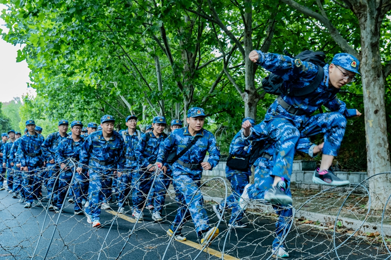与往年不同的是,本次军训行军拉练增加了穿越“铁丝网”障碍等行军项目。全体军训学员途中顺利完成了通过“染毒”地带、遇敌空袭、穿越“铁丝网”障碍等综合科目。