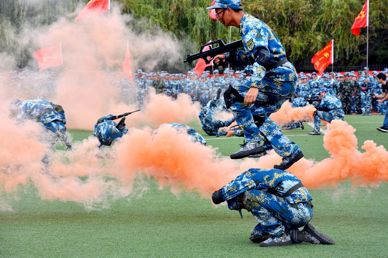 党委书记罗公利宣布军训分列式正式开始,在澎湃激昂的音乐中,19个军训营迈出铿锵有力的步伐,以最饱满的状态先后接受检阅。随后,新生们轮番展示了擒敌拳、匕首操、综合实战演习等特色科目,展现了科大学子斗志昂扬的精神面貌,体现了坚韧不拔、发奋图强的科大精神。