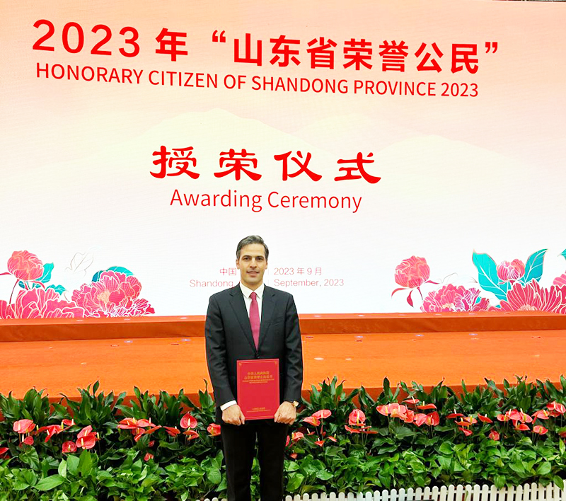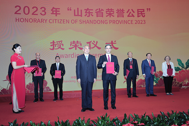9月28日下午,2023年“山东省荣誉公民”授荣仪式在济南举行,省委书记林武,省委副书记、省长周乃翔出席仪式,纳赛尔受邀参加授荣仪式。仪式上,林武为纳赛尔颁发荣誉证书。授荣仪式结束后,纳赛尔受邀参加了省政府国庆招待会,并向省领导汇报了伟德官网在中伊教育、科技、文化以及人才培养方面所作出的卓越贡献,受到省领导肯定和赞赏。