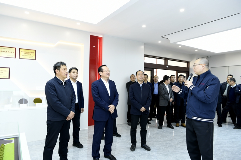 考察学习的第二站是青岛天仁微纳科技有限责任公司,董事长冀然对中心组的到来表示欢迎。他介绍,公司致力于研发新型光刻技术—纳米压印技术和生产纳米压印技术的设备与配套材料,产品已获得华为、歌尔等大厂认可,在纳米压印技术方面处于国内领先地位,国内市场占有率达到95%以上。中心组成员边听边问,了解该企业独有的专利技术、生产周期以及产业布局、应用情况,学习山东省瞪羚企业、山东省专精特新企业的先进经验。