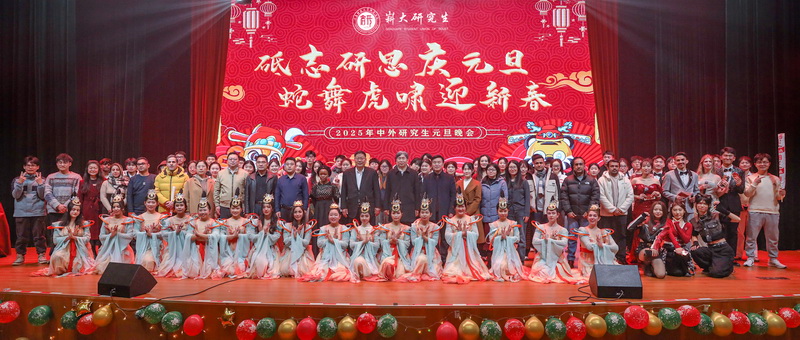 砥志研思庆元旦,蛇舞虎啸迎新春。12月31日,中外研究生齐聚图书馆惟真讲堂,用一场多元文化、青春洋溢的晚会向旧年告别,与新岁共庆。副校长薛庆忠、诸葛福民出席晚会。相关职能部门、各研究生培养单位负责人,研究生导师、辅导员代表及中外研究生等近千人齐聚一堂、共庆佳节。