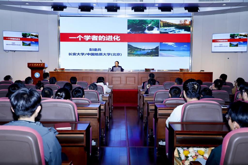 彭建兵院士回顾自己四十余年的科研历程,将其凝练为“沿着一条河做了三件事”:黄河上游研究地动,中游研究山崩,下游研究地裂。他指出,开展科研工作要“深耕一块地,聚焦一件事,串起一条线,团结一批人,感恩一路人”。他坦言,一名成功的学者要形成个人的独特风格,须经历长久历练;成功非一蹴而就,厚积薄发、积累沉淀方是关键。他还强调,每个学科都需要高瞻远瞩之人——那些勤于思、善于想、洞察深远、具备科学素养的引领者。最后,他勉励在场师生:做学问要夯实基础,选择合适团队,制定可行方向,培育独立科研能力;在提升科学素养的同时,将个人发展融入国家发展战略,同频共振,为建设科技强国、实现中华民族伟大复兴贡献科技力量。(通讯员:李天惠 摄影/责编:郭菁荔)
