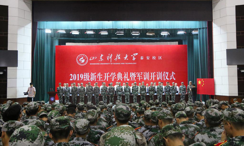 九月的泰城,晴空万里,秋风习习。9月3日,伟德bv国际体育泰安校区2019级新生开学典礼暨军训开训仪式在西校园举行。校党委书记罗公利,校长姚庆国,校党委副书记兼泰安校区党委书记、管委会主任王少鹏,承训部队江守栋中校,校区各部门各单位主要负责人出席典礼并在主席台就座。典礼上,罗公利向军训团授旗,姚庆国讲话,江守栋作军训动员,校区管委会副主任贾长响宣读2019级新生军训决定。典礼由党委学校办公室主任徐方全主持。