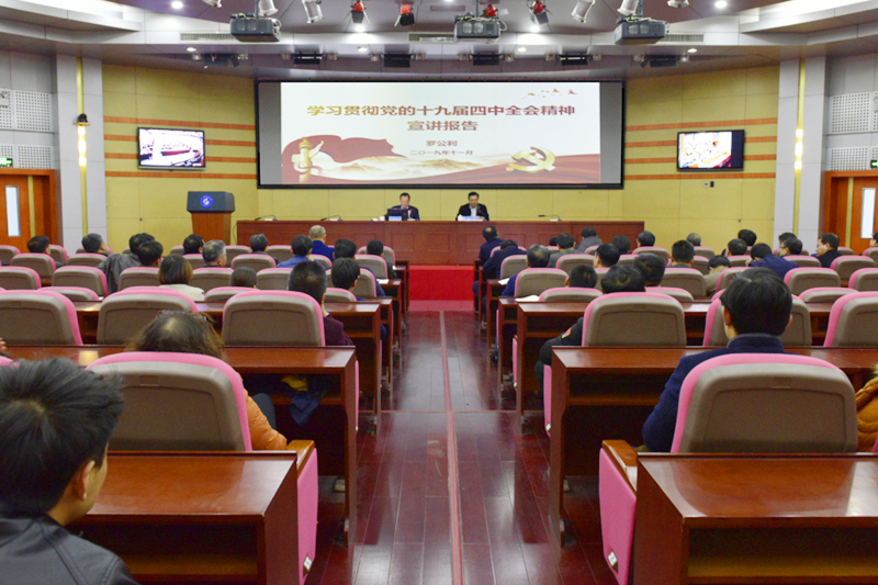 罗公利在报告中介绍了全会的概况、《决定》的形成过程和框架结构,阐述了全会《决定》的重大意义,提出的总体要求、总体目标和重点任务,联系实际解读了中国特色社会主义制度和国家治理体系的显著优势,全面分析了加强党的领导、确保目标任务全面落实到位,并结合学校实际对认真落实全会精神提出了具体要求。