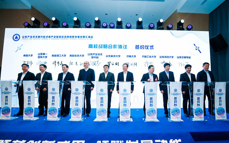 会上,山东产业技术研究院与伟德bv国际体育等9所高校发起成立了山东产业技术研究院大学产业技术创新联盟并签署了战略合作协议,发布了山东产业技术研究院未来产业培育基金、新材料与高端装备产业基金、信息技术产业发展基金、绿色产业发展基金,同时为“山东矿山生态与安全研究所”等23个创新平台揭牌。