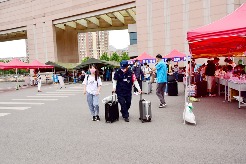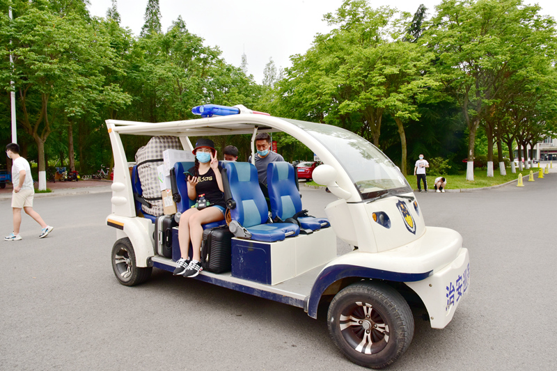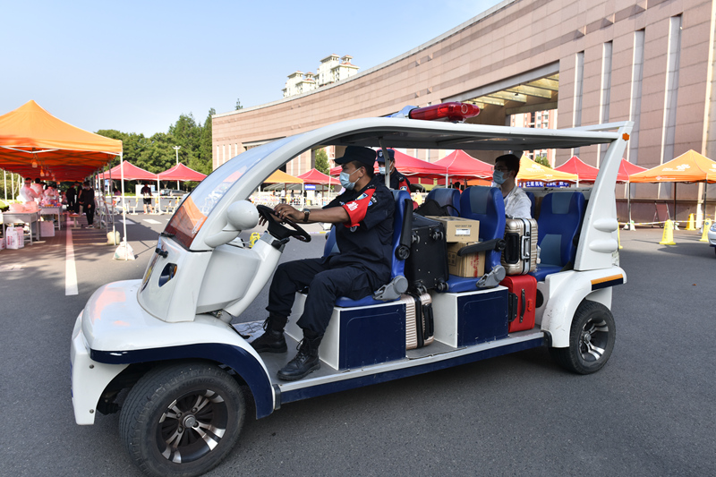 在学校南门,安全管理处的安保人员早早搭好了迎接同学们的帐篷、拉好了隔离线,指挥着校门口的车辆交通。从校门外可以看到,行李多的同学进入校门后,安保人员上前接过大包小包,用摆渡车送同学们。