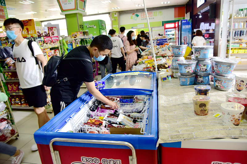 在学校维客超市门口,一辆装有可乐、奶茶等饮品的配送车正在卸货,超市里饮料、水果、面包、毛巾、肥皂等食品和日常用品供应充足。据超市经理唐照军介绍,天气炎热,为满足同学们的需要,超市备货了大批西瓜、冷饮等消暑产品,每天工作人员会及时统计货架商品情况,及时补货。