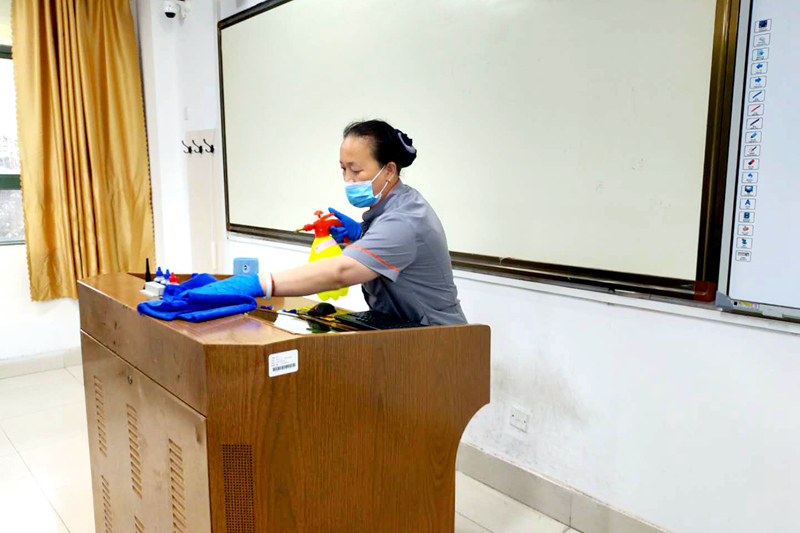 经过专业培训的消杀人员,每天坚持对校园公共环境、楼宇公共区域及餐饮、宾馆等进行规范消毒,相关人员每天打开教室门窗通风换气,每天对教学楼公共区域、电梯、卫生间等进行消杀,确保每个细节、每个步骤落实到位。