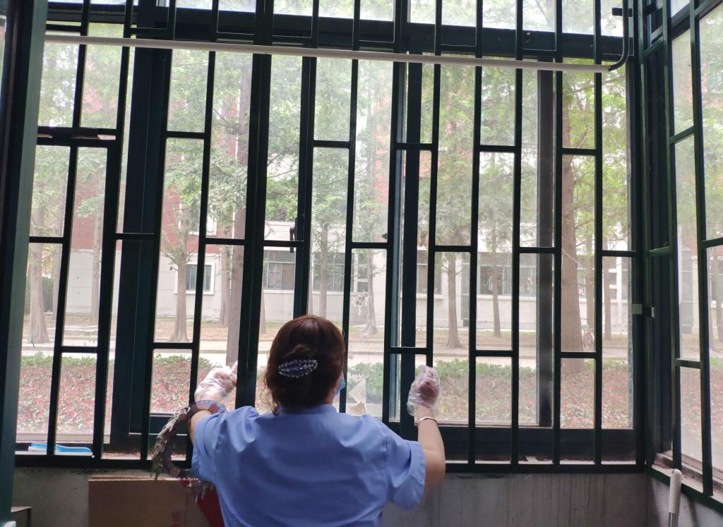 4月23日起,学生公寓管理服务中心上线“阿姨来帮忙”云服务业务,包括宿舍通风、绿植浇水、垃圾清理、晾晒衣物等四项服务。109位宿管阿姨和百余名辅导员把提出需求的学生被褥一床一床搬至楼下晾晒。