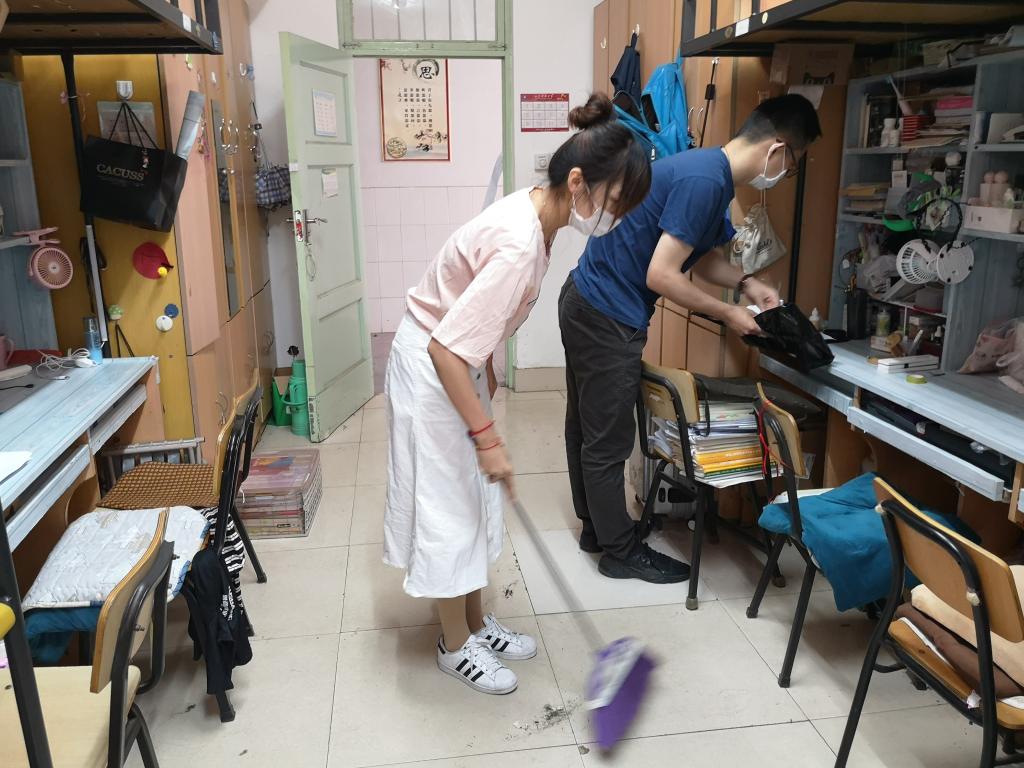 学生进入宿舍时,要进行消毒、核对信息,发放一次性垃圾袋,开展“学生公寓垃圾下楼”,时刻保持宿舍环境干净、安全。