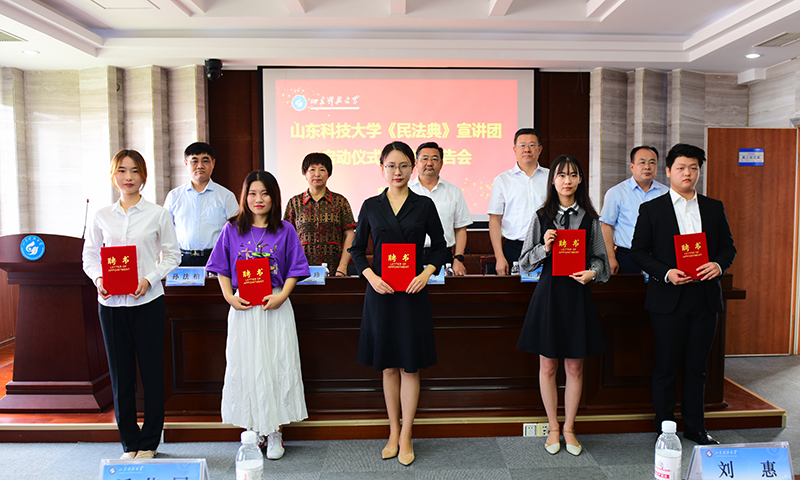在宣讲团成立启动仪式上,伟德bv国际体育党委副书记尹华代表学校致辞,伟德bv国际体育党委常委、宣传部部长李克周宣读《关于成立伟德bv国际体育〈中华人民共和国民法典〉宣讲团开展宣讲活动的通知》,青岛市黄岛区人民法院党组书记、院长王光金,青岛西海岸新区司法局党委委员、副局长张光珍到会祝贺并讲话。成立仪式上,有关领导为宣讲团教师和学生代表颁发了聘书。