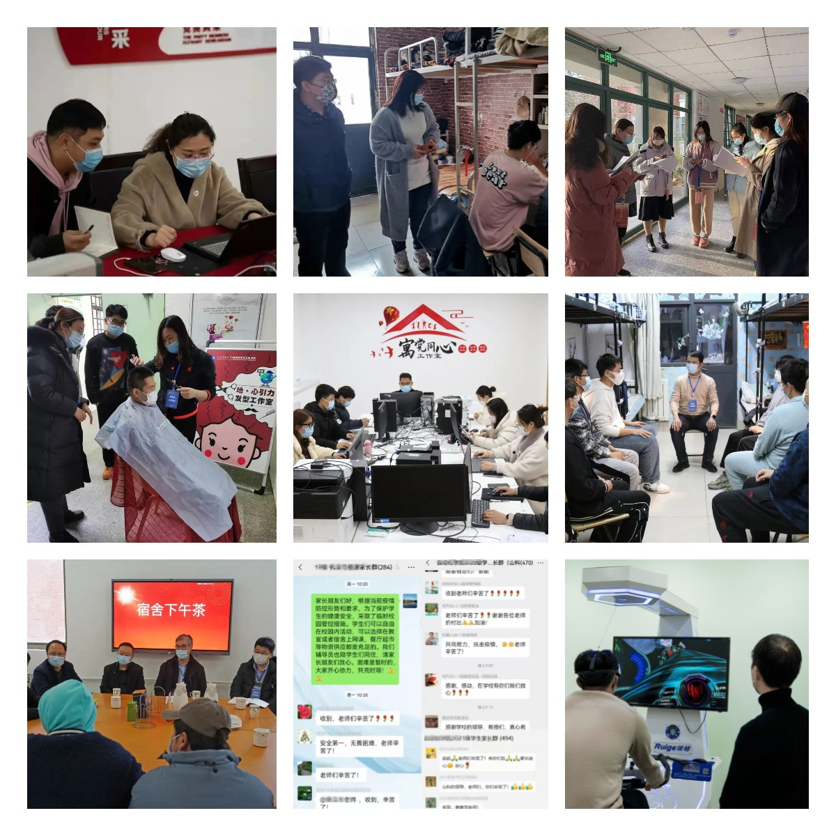 针对校园封闭管理期间的学生管理工作,在生活区建立“区长—楼长—层长—宿舍长”四级管理体系。辅导员们组织全体学生进行了5轮全员核酸检测,他们督促同学们戴口罩、落实一日三检和宿舍通风、消杀,他们尽力保障学生生活正常化,按时上网课。他们化身学生的速递员、理发师、采购员,尽心尽力去解决困难、服务同学。他们走进宿舍与学生们谈心,了解学生的需求,及时疏导学生的心理压力……他们还和学生一起制作了颇具创意的防疫顺口溜、防疫手势舞、快板新说唱等文化作品,引导学生科学防疫,纾解压力。辅导员就这么陪伴着学生们,一天天在忙忙碌碌、琐琐碎碎中度过,平凡而真实。