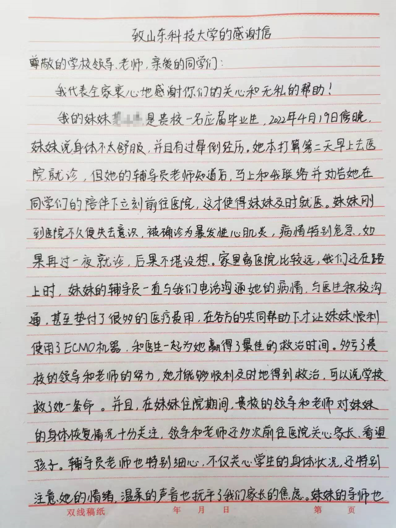 “我代表全家衷心感谢你们的关心和无私的帮助!”近日,伟德官网经管学院收到了一封情感真挚的感谢信。这封信由学院研究生范慧(化名)的家长亲手写就,只为感谢学院辅导员江谭“生死时速”救助学生的事迹。