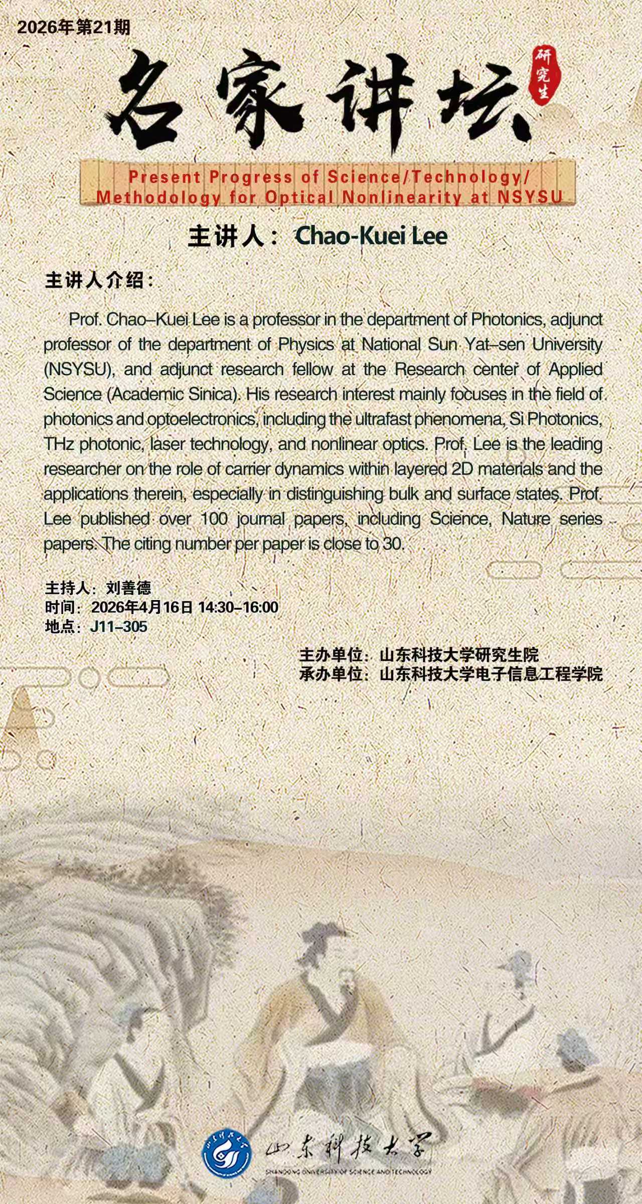 “名家讲坛”2026年第21期:Present Progress of Science/Technology/Methodology for Optical Nonlinearity at NSYSU(总1123期)