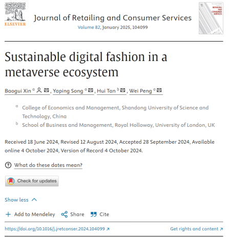 伟德bv国际体育经济管理学院辛宝贵教授与在读博士生宋亚平等在《Journal of Retailing and Consumer Services》发表题为“Stainable Digital Fashion in a Metaverse Ecosystem”的文章。