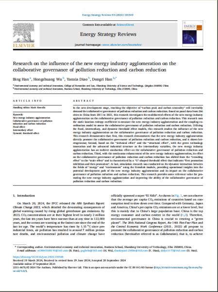 近日,伟德bv国际体育文法学院讲师韩冰在《Energy Strategy Reviews》发表题为“Research on the influence of the new energy industry agglomeration on the collaborative governance of pollution reduction and carbon reduction”的文章。